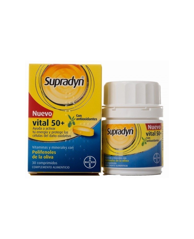 La dosis recomendada es 1 comprimido al día. El producto es para adultos y específicamente recomendado para mayores de 50 años. No superar la dosis diaria recomendada. No utilizar como sustituto de una dieta equilibrada. Se recomienda seguir una dieta variada y equilibrada y un estilo de vida saludable. No recomendado para niños ni mujeres embarazadas o en periodo de lactancia. Complemento alimenticio. Sin gluten. Sin azúcares. Mantener fuera del alcance de los niños. No conservar a temperatura superior a 25 °C. Mantener el envase debidamente cerrado. Carbonato cálcico, Celulosa (E460i) (Agente de carga); Ácido L-ascórbico, Maltodextrina (Agente de carga); óxido magnésico; Acetato de D-alfa-tocoferilo; Carboximeti¡celulosa sódica (E468) (Antiaglomerante), Extracto de hojas de olivo; Nicotinamida; Fumarato ferroso; Hidroxipropilmetilcelulosa (E464) (Agente de recubrimiento); Polidextrosa (E1200) (Agente de carga); óxido de zinc; Antiaglomerantes: Dióxido de silicio (E551), Sales magnésicas de ácidos grasos (E470b), Talco (E553b); D-Pantotenato cálcico; Palmitato de retinol; Extracto de oliva; Colorantes: Dióxido de titanio (E171), óxido de hierro amarillo (E172); Sulfato de manganeso; Clorhidrato de piridoxina, Sulfato cúprico, Riboflavina, Colecalciferol, Mononitrato de tiamina, Triglicéridos de cadena media (Agente de recubrimiento), Yoduro potásico, Ácido p-teroilmonoglutámico, Molibdato sódico, Selenito sódico, D-biotina, Cianocobalamina. Por comprimido: Polifenoles de oliva 5 mg: Oleuropeína 4,5 mg, en forma de extracto de hojas de olivo titulado al 21 % (21,43 mg). Hidroxitirosol 0,5 mg, en forma de extracto de fruto de olivo titulado al 10 % (5,00 mg) Complemento alimenticio a base de Vitaminas y Minerales con Polifenoles de la oliva, nutrientes que complementando la dieta habitual, ayudan a mantener la energía y vitalidad, además de proteger a las células del daño oxidativo. Su fórmula específica, a base de 12 Vitaminas, 9 Minerales y Polifenoles de la oliva hacen de Supradyn® vital 50+ un complemento alimenticio especialmente apropiado para las personas con una actividad intensa. Las Vitaminas y Minerales de Supradyn@ vital 50+ están equilibrados en las dosis y proporciones más adecuadas, de acuerdo con las tablas de Valores de referencia de nutrientes. Por comprimido: Vitamina A (Retinol): 400 mcg Vitamina D3 (Colecalciferol): 5 mcg Vitamina E (Tocoferol): 24 mg Vitamina C (Ácido Ascórbico): 160 mg Vitamina B1 (Tiamina): 1,65 mg Vitamina B2 (Riboflavina): 2,10 mg Vitamina B3 (Niacina): 24 mg Vitamina B6 (Piridoxina): 2 mg Vitamina B9 (Ácido fólico): 200 mcg Vitamina B12 (Cianocobalamina): 2,5 mcg Biotina: 75 mcg Ácido pantoténico: 9 mg Calcio: 120 mg Hierro: 7 mg Magnesio: 60 mg Cobre: 1 mg Manganeso: 2 mg Iodo: 75 mcg Molibdeno: 50 mcg Selenio: 50 mcg Este producto lo puede tomar una persona celiaca, alérgica/intolerante al huevo, o intolerante a la leche.